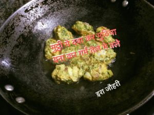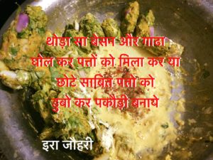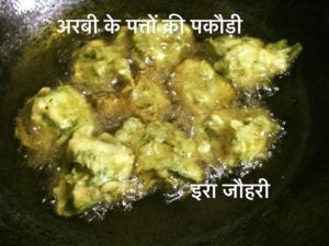 इस बार जब बाजार से अरबी के पत्ते घर लाये तो सोंचा कुछ अलग तरह से बनाये फिर अपनी सासूमाँ का तरीक़ा याद आया इस विधि से बनाने पर बेसन भी कम लगता है और स्वादिष्ट तो बनते ही हैं तो सबसे पहले पत्तो को डन्ठल सहित साफ करके महीन महीन काट ले चाहे तो डन्ठलों को छील साफ करके अलग सब्जी बनाये और फिर कटी सामग्री में अन्दाज से इतना बेसन डाले जितने मे सब आसानी से मिल जाये साथ ही नमक ,मिर्च ,कटा प्याज ,लहसन ,हल्दी ,धनिया ,गरममसाला और हीँग डाल कर सब आपस मे मिलाये और पानी के हल्के छिट्टे दे कर सबको आपस मे बाँध कर मुठ्ठी मे दबा कर मुठिया और लम्बे रोल बनाये और थोड़ी सी सामग्री बचा कर उसमे थोड़ा सा बेसन और गाढा घोल कर पत्तों को मिला कर या छोटे साबित पत्तो को डुबो कर पकौड़ी बनाये