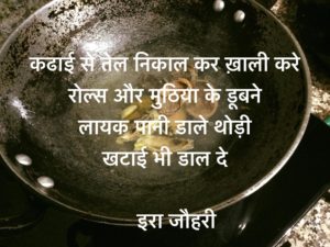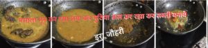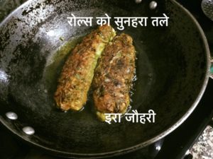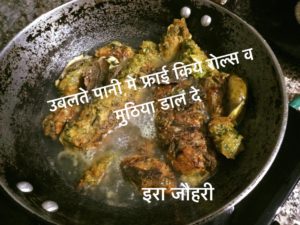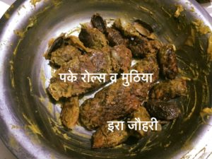 कढाई से तेल निकाल कर ख़ाली करे रोल्स और मुठिया के डूबने लायक पानी डाले थोड़ी खटाई भी डाल दे और उसमे मुठिया व रोल्स डाल कर पानी सूखने तक ढक कर पकाये और फिर पिसा मसाला( प्याज ,लहसन ,अदरक ,हल्दी ,धनिया ,मिर्च, नमक ,गरममसाला )भून कर रसा लगा कर मुठिया डाल कर रझा कर सब्जी बनाये