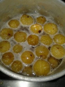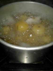 अब अल्मुनियम के भोगने मे पानी उबलने के लिये रखे उबलते पानी मे गोदे गये ऑवले डाल कर उबाल आने पर गैस बन्द कर दे