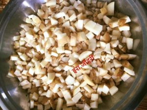 सबसे पहले कच्चे आलू छिल्के समेत छोटे छोटे टुकड़ो मे काट कर साफ पानी मे डुबो कर अच्छी तरह धो लीजिये