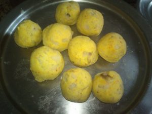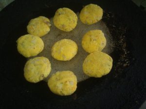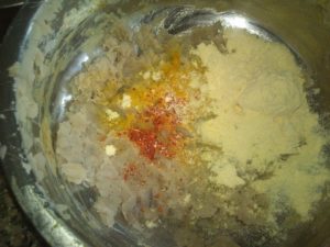 कोफ्ते या कबाब बनाने के लिये भर्ते मे बेसन हींग नमक मिर्च हल्दी धनिया पिसा लहसन प्याज़ अदरक मिलाये