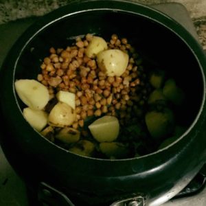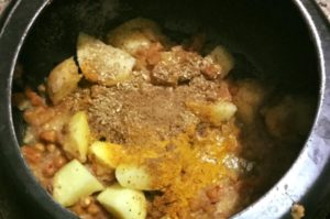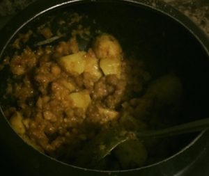 पहले ज़रा से देशी घी मे मुँगौड़ी भूने कटे आलू मिलाये