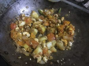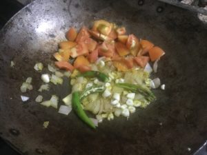 गर्मतेल मे हरीमिर्च कटाप्याज लहसुन अदरक व टमाटर डाले