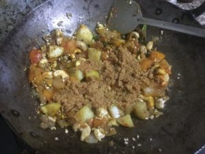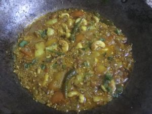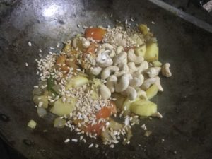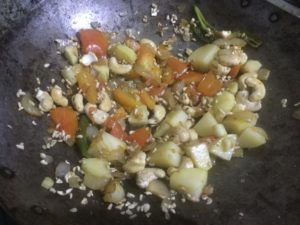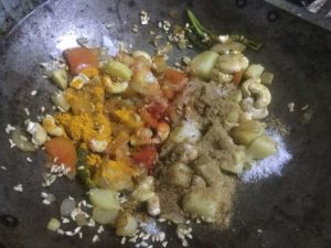 कटे आलू व काजू डाल कर हल्का भूने