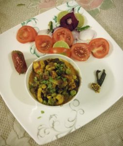 काजू , मटर ,मखाना ,पनीर की लज़्ज़तदार ज़ायक़ेदार रसीली सब्जी साथ मे लाल व हरी मिर्च का अचार व सलाद भी है