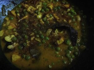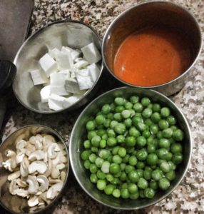 जब सब भुन जाये जरा सा पानी डाल कर हल्दी धनिया मिर्च डाले पकाये मलाई डाले भूने व कटा पिसा टमाटर या टमाटर प्यूरी डाले पकाये और काजू मटर व पनीर भी डाल कर चला फिरा कर भून कर पानी डाल कर रसा लगा कर तश्तरी ढक कर और उस पर थोड़ा पानी डाल कर रझाये व पकाये