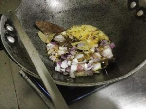 गर्मतेल मे जीरा वतेजपत्ता डाल व भून कर कटा प्याज डाले