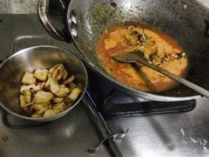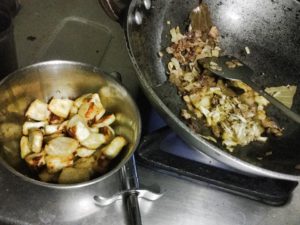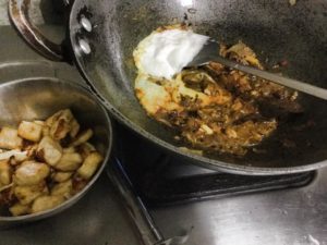 प्याज जब भुनने वाला हो तब कुटा लहसन व अदरक डाले व भूने