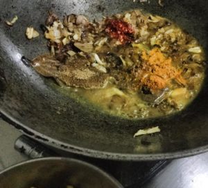 जब सब भुन जाये थोड़ा सा पानी डाल कर हल्दी धनिया नमक व मिर्च डाले पकाये व भूने