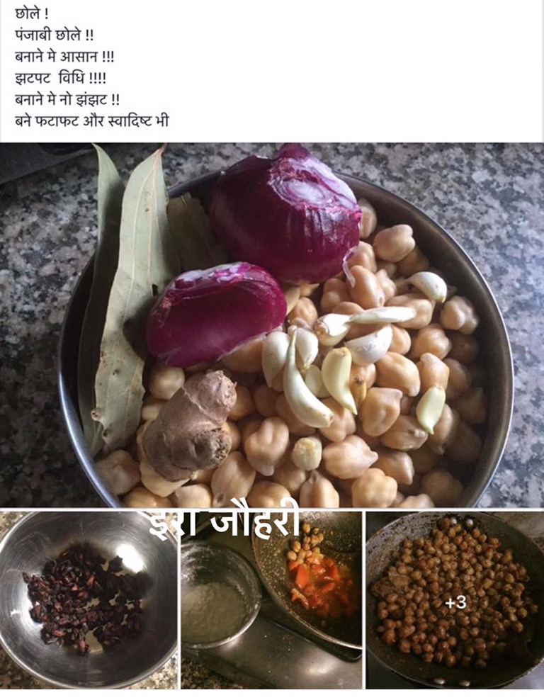 भीगे फूले काबुली चनों को कटे प्याज लहसन अदरक नमक और तेजपत्ता के साथ पानी डाल कर उबाल कर गर्मतेल मे हीग जीरा मिर्च से छौक लगा कर टमाटर व दही को भून कर मिलाये। भुना पिसा गरम मसाला व अनार दाना मिलाये