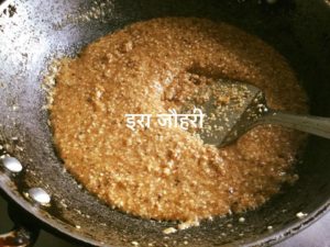 खोया मिला भुना तिल उसमे मिला कर अच्छी तरह चलाये जब किनारे को सामग्री छोड़ने लगे तब गैस बन्द कर दे