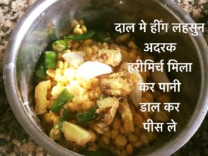 दाल मे हीँग ,लहसुन ,अदरक ,हरीमिर्च मिला कर पानी डाल कर पीस ले