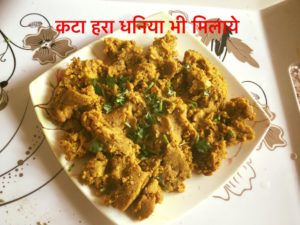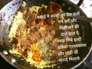 कढाई मे सरसों का तेल डालें गर्म करें और पिसी चनें की दाल डाल दे नमक मिर्च हल्दी धनिया गरममसाला और थोड़ी सी खटाई मिलाये
