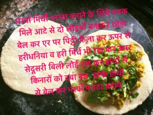 भरवाँ मिर्ची पराठा बनाने के लिये नमक मिले आटे से दो लोइयाँ बनाकर थोड़ा बेल कर एर पर पिट्ठी फैला कर ऊपर से हरीधनिया व हरी मिर्च भी रख कर ऊपर सेदूसरी बिली लोई रख कर हाथों से किनारों को दबा कर हल्के हाथों से बेल कर भरवाँ पराठा बनाये