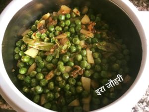 हरी मटर को हमने महीन टुकड़ो मे कटे आलू और मटर के छिल्कों के साथ जीरे मिर्च से छौक कर नमक मिला कर ढक कर धीमी आँच पर पकाया है