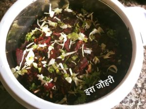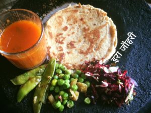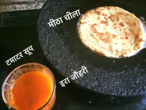 चुकन्दर की सूखी सब्जी , मटर आलू , गुलाबजामुन की चाशनी से बना चीला व टमाटर सूप