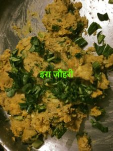 • हरी धनिया ,हरे प्याज की पत्तियाँ कुछ मेंथी के साग की भी पत्तियाँ काट कर मिलाये