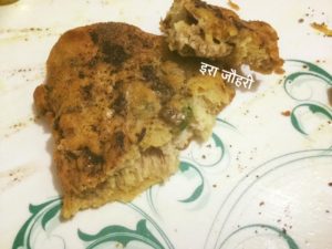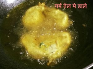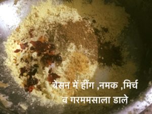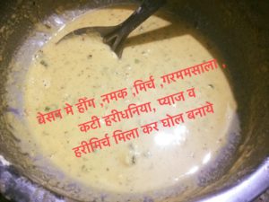 बेसन मे हीग नमक मिर्च व गरममसाला डाले