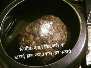फिटकरी या खटाई डाल कर जिमीकन्द उबाल कर पका गला व छील कर बड़े बड़े पतले टुकड़ों मे काटे और बेसन के घोल मे डुबो कर तेज आँच पर तल कर चाटमसाला बुरक कर नींबूका रस डाल कर स्वाद के मजे ले