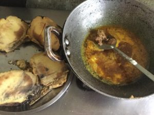 तेल गर्म कर के पिसा मसाला ( प्याज लहसन अदरख हल्दी धनिया मिर्च गरम मसाला ) डाले भूने थोङा दही भी डाल कर भूने फिर थोंङा पानी मिलाये सभी टुकङे एक एक कर। डाले फैला कर भूने
