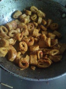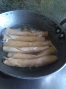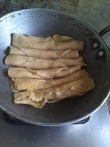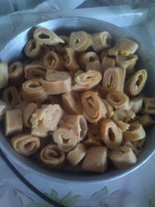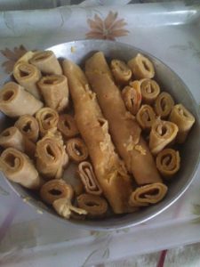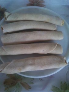 बीच मे करछुली की डन्डी रख कर रोल करे उबलते पानी मे रख कर पकाये ठंडा होने पर टुकङो मे काट ले कटे प्याज व पिसे लहसन अदरख हल्दी धनिया नमक मिर्च का तेल मे मसाला तैयार कर ददनुक्से तैयार करे