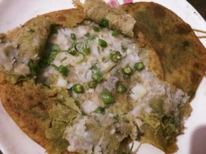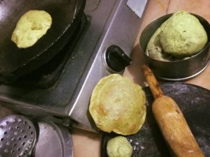 पूड़ी कचौड़ी को हम लोगो के यहाँ पक्का खाना कहा जाता है त्योहारों और पर्व पर परम्परा के हिसाब से रोटी नही बनाई जाती है हाँ अब समय के हिसाब से बदलाव आ गया है तो हमारे घर मे भी बनाई गयी हरी मेथी को उबाल कर पीस कर बनाई गयी हरी पूड़ियाँ और आलू भरी कचौड़ियाँ और साथ ही गेहूँ के आटे से बनी सफेद पूड़ी व कचौड़ी और रसीली मटर पनीर व सिंघाड़े की सब्जी तथा सूखी मेथी आलू की सब्जी व चटनी यह सब हमारी जिठानी मधु जौहरी ने बनाया है हमने बस उनका साथ दे दिया है और हम जब साथ होते है अपने दोनो के लिये जो हरीमिर्च की कचौड़ियाँ बनाते है यानी आलू की कचौड़ी मे खूब सारी हरीमिर्च डाल कर बड़ा कचौड़ा बनाते है जो बहुत ही बढिया लगता है