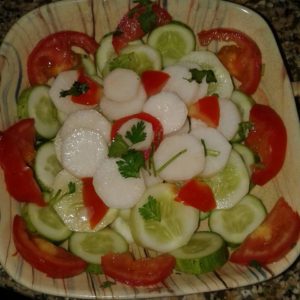 बेसनीमूली प्याज वाली भिन्डी बूँदी का रायता आम की चटनी गुड़म्बा चावल और सलाद