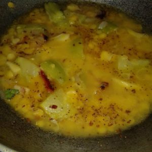 अरहर की दाल हल्दी नमक डाल कर उबाल कर एक छोटा टुकड़ा लौकी छील कर बड़े टुकड़े मे काट कर और एक तरोई छील कर बड़े टुकड़े कर के उबाल कर पकाये और फिर राई जीरा प्याज और साबित लालमिर्च तोड़ कर छौंके और कच्ची अमिया डाल कर रझाये