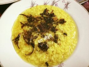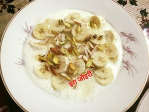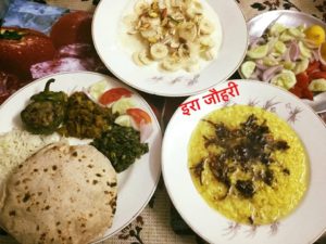 दोपहर का भोजन उड़द की दाल ,बेसनी फली ,गरममसाले के आलू , भरवाँ शिमला मिर्च के साथ रोटी चावल ,सलाद और मुँह मीठा करने के लिये मीठा दही केला है।