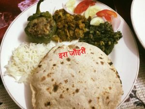 बेसनी भट्ट की फली ,नारी का साग ,गरममसाले के आलू व भरवाँशिमला मिर्च