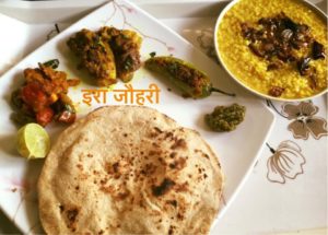 हींग मिर्च से छुकी और देशी घी मे भुना प्याज पड़ी धुली उड़द की दाल ,मोटी रोटी ,बेसनी मोटी मिर्च और टमाटर की चटपटी मिर्चें और पीठे का केला व आलू चटनी चूल्हे की ऑच पर सिकी बड़ी बड़ी मोटी रोटी का स्वाद किस किसने चखा है वही स्वाद मैने गैस की धीमी ऑच पर लाने का प्रयास किया है धीमी ऑच पर सिकी मोटी रोटी हो और उस पर देशी घी लगा हो और साथ मे धुली उड़द की दाल हो तो स्वाद के क्या कहने
