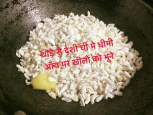 थोड़े से देशी घी मे धीमी आँच पर खीलो को भूने