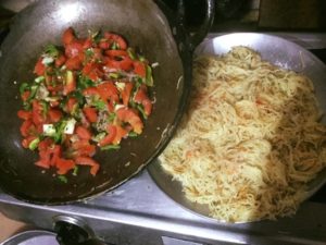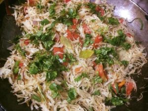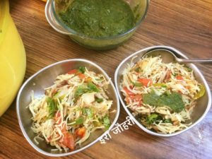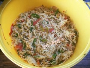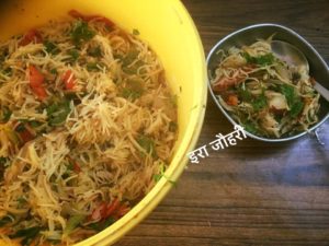 सिवइयो को हल्की चिकनाई मे करी पत्ता राई मिर्च से तड़का दे कर हल्का भून कर पानीडाल कर गला कर पका कर निकाल ले (पानी सिंवइयो के लगभग बराबर ही पड़ जाता है ) अब फिर से थोड़ी चिकनाई डाल कर कटा प्याज डाल कर हल्का भून कर कटी गाजर और फिर शिमलामिर्च व टमाटर डाल कर चला फिरा कर हल्का भून कर नमक मिला कर पकी सिवइयो को डाल कर चला फिरा कर भून कर गरमगरम ही परोसे विस्तृत जानकारी के लिये कृपया पोस्ट खोल कर देखे