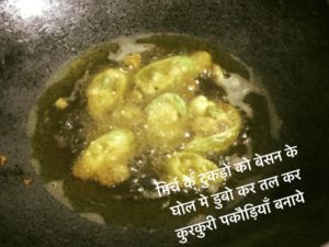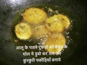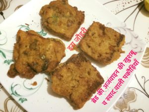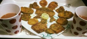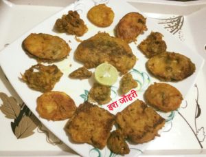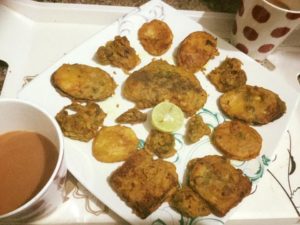 वेजिटेविल फ़िश पकौड़ा यानी जिमीकन्द के पकौड़े , मोटी मिर्च की नन्ही कुरकुरी पकौड़ियाँ ,फूलगोभी की मस्त कुरकुरी पकौड़ियाँ ,आलू की चिप्स वाली करारी पकौड़िया ,बैगन की बैंगनी और ब्रेड की अजवाइन की खुशबू व स्वाद वाली पकौड़ियाँ