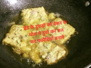 ब्रेड के टुकड़ों को बेसन के घोल मे डुबो कर तल कर पकौड़ियाँ बनाये