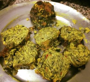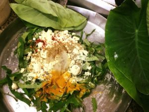 घुइया के पत्तों को डन्डियाँ के साथ काट कर बेसन मे मिला कर बनाये स्वादिष्ट पतोड़े !!!!