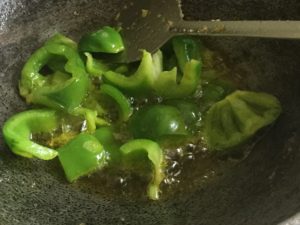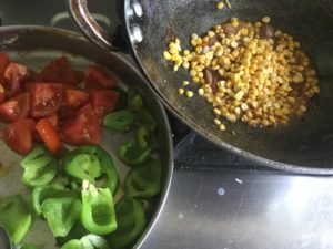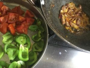 टमाटर व शिमला मिर्च को मोटे टुकड़ो मे काले प्याज को पतला पतला काटे मिर्च डालना हो तो साबित लालमिर्च डाले