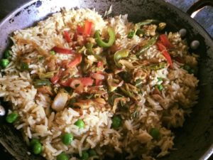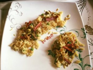 हरी मटर के पुलाव मे सुबह की बची बन्दगोभी , गाजर और शिमलामिर्च की मिक्स सब्जी मिला कर बनाया नये स्टाइल से सब्ज़ पुलाव