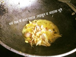 गर्म तेल में कटा प्याज लहसुन व अदरक भूने