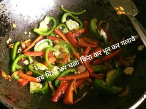 लम्बाई मे कटी गाजर मिलाये गाजर चला फिरा कर भून कर लम्बाई मे कटी शिमला मिर्च मिलाये