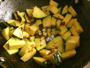 गर्म तेल मे मेथी दाने से तड़का दे कर लहसन भून कर कुटी लालमिर्च डाल कर कद्दू छौंके