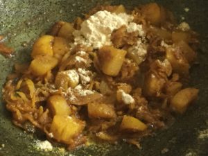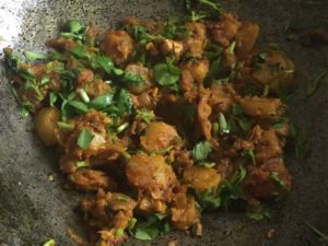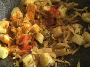 मूली काट कर या कद्दूकस से कस कर ( हमारे पास दोनो तरह की थी तो हमने दोनो मिला दी ) थोड़े से तेल मे मेथी मिर्च से छौक कर कटा प्याज भून कर छौंक दे हल्का पानी डाल कर पिसी हल्दी धनिया नमक मिला कर ढक कर धीमी आँच पर पकाये और पकने पर बेसन बुरक कर मिला कर भून कर बेसनी मूली बनाये हमने जो मात्रा दिख रही है उसमे एक चम्मच बेसन मिलाया है और फिर कटी हरी धनिया से सजाये