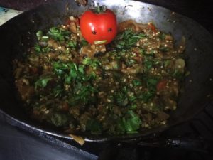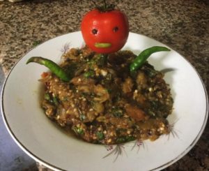 कढाई मे तेल गर्म करके सबसे पहले कटा प्याज भूने हल्का गुलाबी होने पर कटा टमाटर हरीमिर्च मिलाये टमाटर भी गलने व भुनने पर भुना बैगन मिलाये सब मिला कर भूने व हराधनिया ऊपर से मिलाये