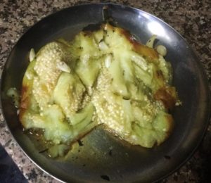 छिलका छील कर बीच से बैगन को खोल दे अगर बीजे बड़े हो तो निकाल दे मुलायम बीज रहने दे
