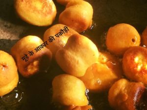 बेसन मे हीग नमक मिला कर पानी डाल कर गाढा घोल बना कर अच्छी तरह फेंटे और गरम तेल की आँच धीमी करके पकौड़ियाँ तोड़े और करछुली से हिलाते हुये मध्षम व तेज़,आँच पर पकौड़ियों पर गर्म तेल डाले इससे पकौड़ियाँ फूल कर मूढ़े की आकार की हो जायेगी पकौड़ी बनाने के बाद कढी बनाने के लिये बेसन के बराबर मात्रा मे दही ले कर बेसन मे मिला कर पानी डाल कर पतला घोल बनाये नमक व हल्दी मिलाये