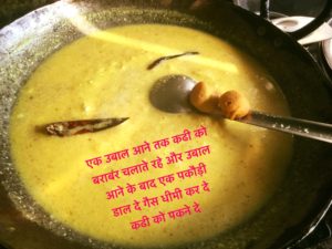 एक उबाल आने तक कढी को बराबर चलाते रहे और उबाल आने के बाद एक पकौड़ी डाल दे गैस धीमी कर दे कढी को पकने दे