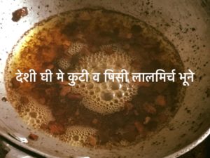 एक अलग पैन मे देशी घी मे कुटी व पिसी लालमिर्च भूने