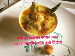 पकी हुई कढी को परोसते समय ऊपर से लालमिर्च वाला देशी घी डाले कुछ लोग देशी घी मे जीरा भून कर भी ऊपर से डालना पसन्द करते है