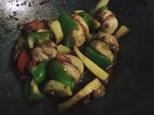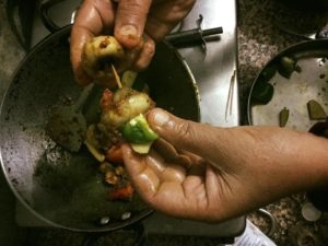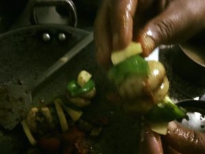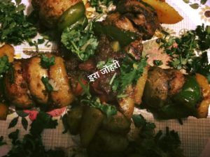क्रमश: आलू शिमलामिर्च मशरूम की कटोरी जैसा एक हिस्सा उस पर भुना मसाला भरे फिर दूसरा मशरूम का उसी के बराबर वाला हिस्सा रख कर सीक पर लगाये और शिमला मिर्चतथा। आलू लगा कर सीक पूरी करे