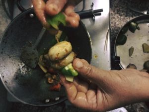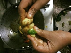 कटा टमाटर व डन्डी के टुकड़े डाले भूने